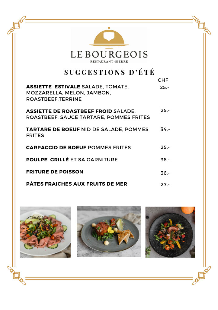 Le Plaisir de vous faire Plaisir ! Au-delà du slogan, cette phrase résume notre philosophie de travail. Notre meilleure récompense est votre satisfaction. Situé au centre de Sierre, le Restaurant Le Bourgeois est considéré comme un point de rencontre idéal – que ce soit pour un apéro spontané, un rendez-vous d’affaires, un dîner romantique à deux ou un anniversaire.